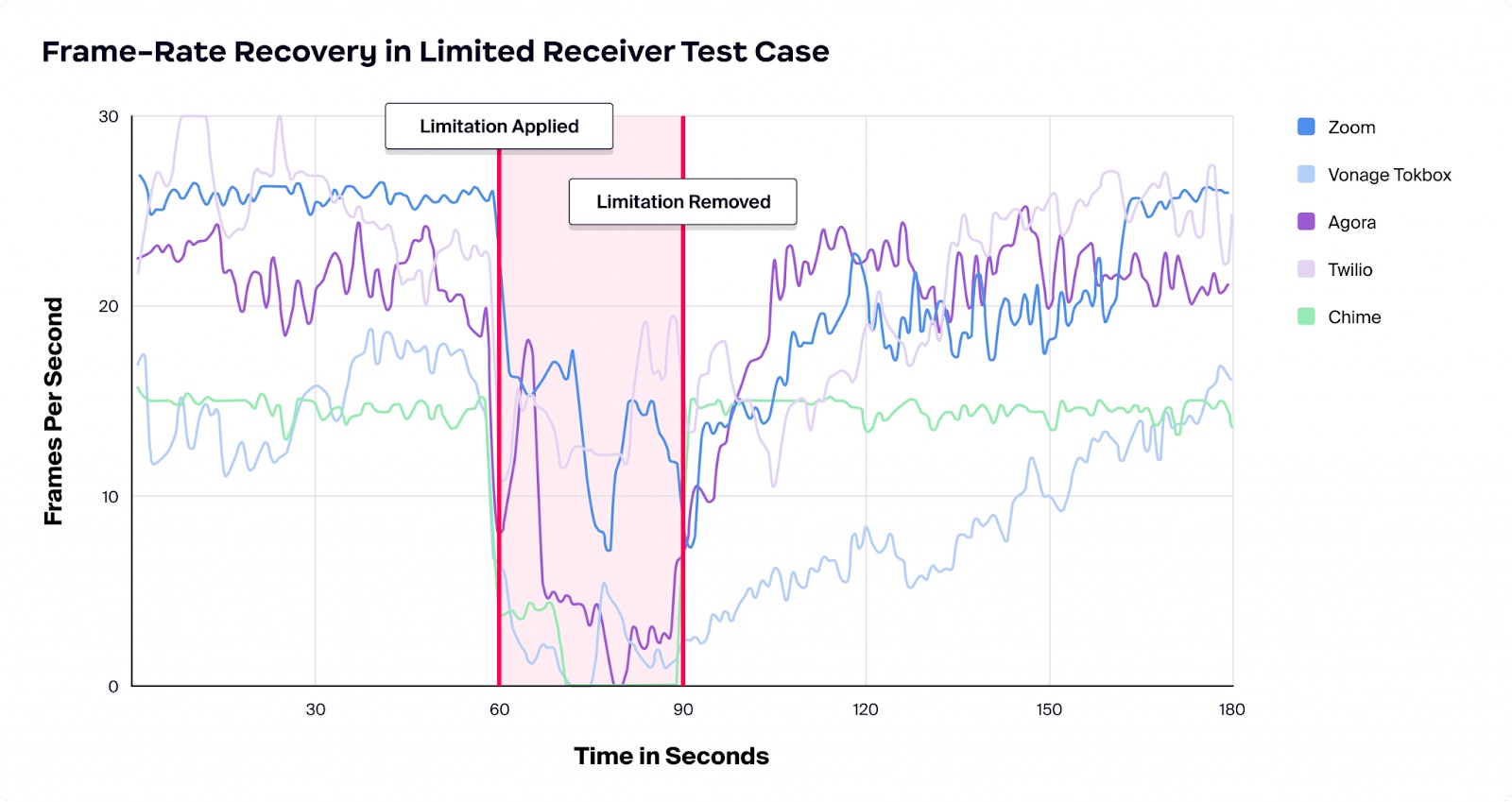 Zoom Video SDK frame-rate recovery performance performs well in limited reception compared to Vonage Tokbox, Agora, Twilio Programmable Video, and Chime in frames per second over time.