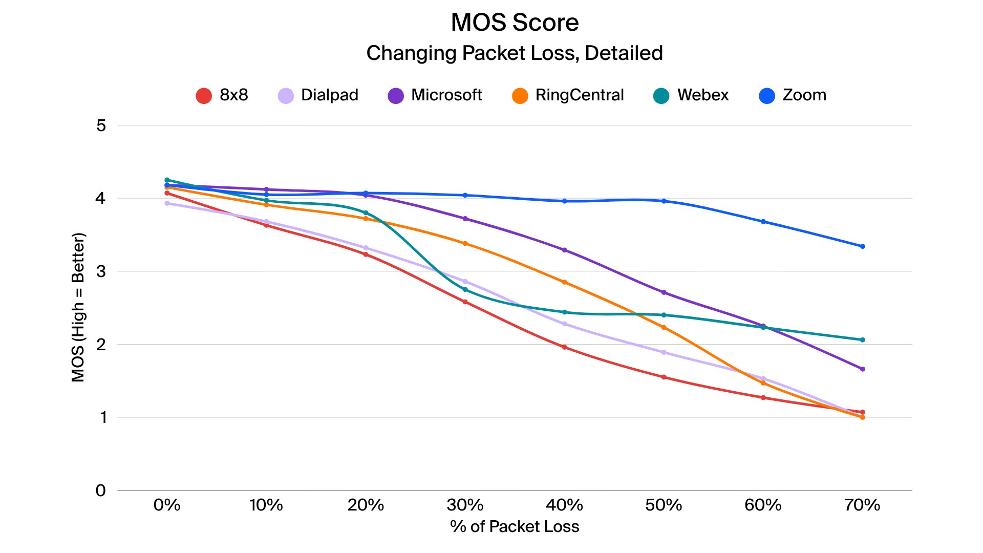 - At 70 percent packet loss, Zoom retains a MOS score of 3.3, outperforming all competitors. Zoom does that by dynamically adjusting bandwidth during packet loss to preserve call quality.